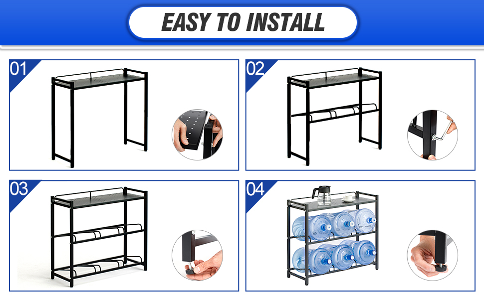 Here’s a smoother, more natural-sounding version: Sturdy, compact, and easy to install. I have a small kitchen, and this shelf has really helped me save space and keep my water jugs organized. I’d definitely recommend it to anyone working with limited space, minimal setups, or even college students. It’s ideal for dorm rooms, studios, kitchenettes, break rooms, and offices.