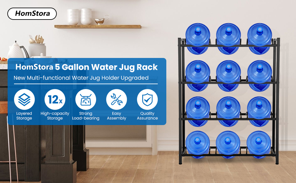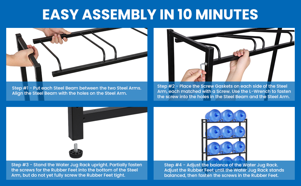 💧EASY ASSEMBLY: Our water jug rack’s steel beams and arms are both formed by bending the entire steel tube without multiple sections and weld points, Only a few components need to be assembled, you can assmble the water bootle rack within 10 minutes.