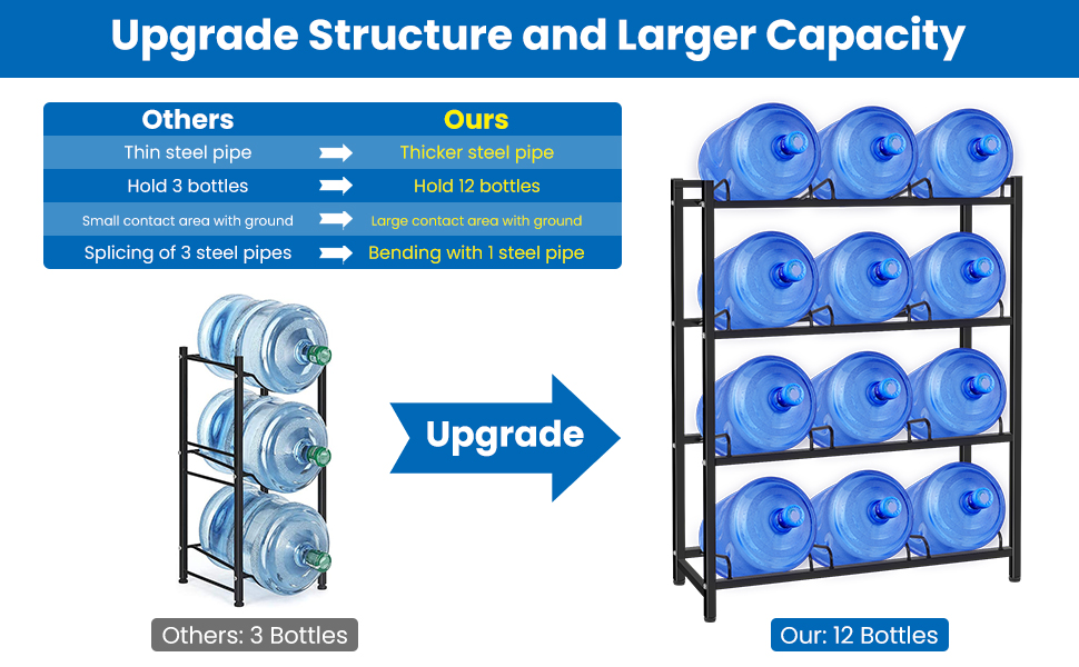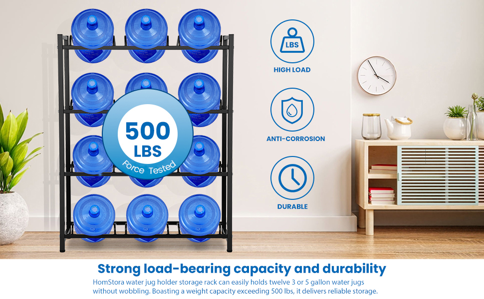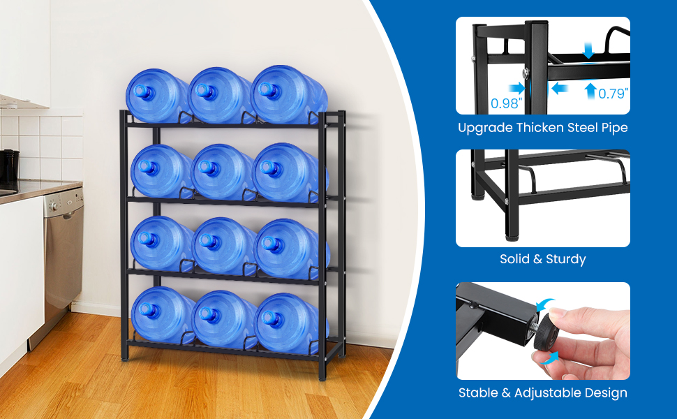 💧STRONG LOAD-BEARING: Water jug rack can easily hold twelve 3 or 5 gallon water bottles without wobbling while boasting a weight capacity exceeding 500 LBS for reliable storage. Each steel arms and steel beam are made of whole thickened steel pipe.
