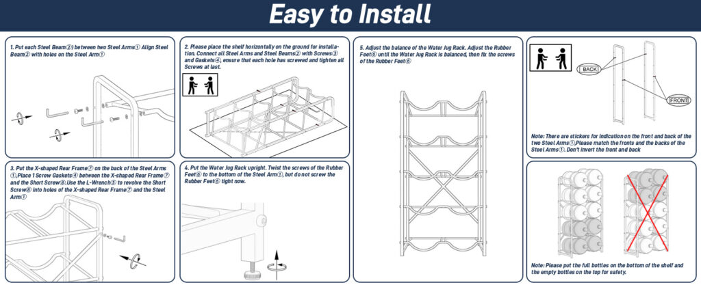 💧Easy To Assemble & Save Space: Comes with assembly instructions.Save time and energy with the easy, no special tools required assembly of our 5 gallon water jug rack.